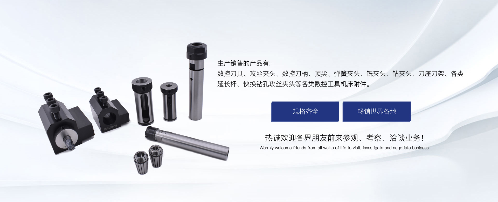 生產(chǎn)銷售的產(chǎn)品有:數(shù)控刀具、攻絲夾頭、數(shù)控刀柄、頂尖、彈簧夾頭、銑夾頭、鉆夾頭、刀座刀架、各類延長桿、快換鉆孔攻絲夾頭等各類數(shù)控工具機床附件。